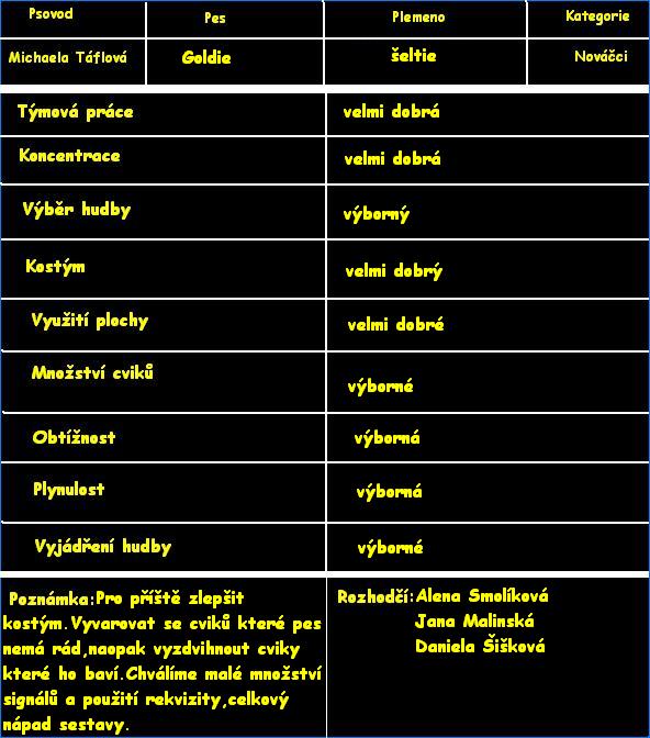Goldie běhala pomalu a v každém běhu jsme měli alespoň 2 zaváhání.Přesto jsem z výsledků spokojená :).Jinak jsme si to tam užili...natáčela nás i televize a včera jsme byli na primě ve zprávách nebo kde já sem to neviděla :D.Fotky najdete u mě na facebooku :D.
